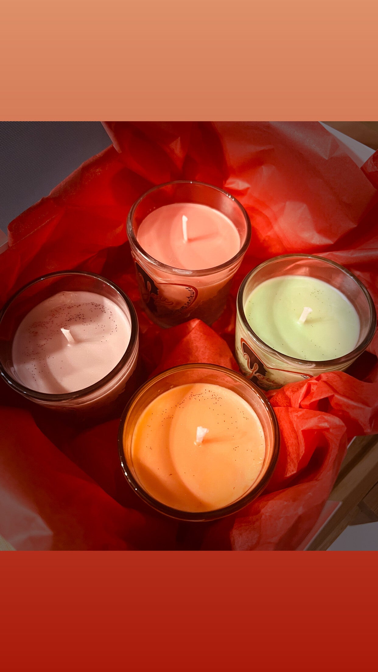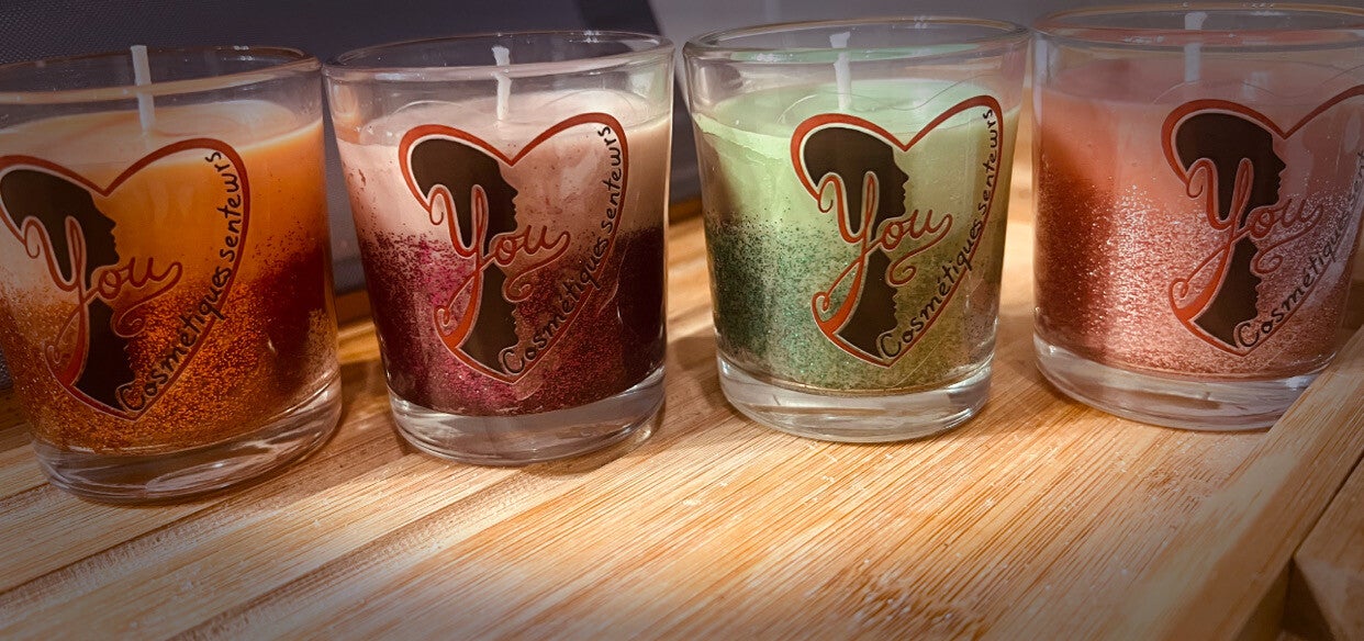 Coffret de 4 bougies parfumées de 60g,coulées à la main, à base de cire de soja et cire d'abeille, pour une combustion propre et homogène.